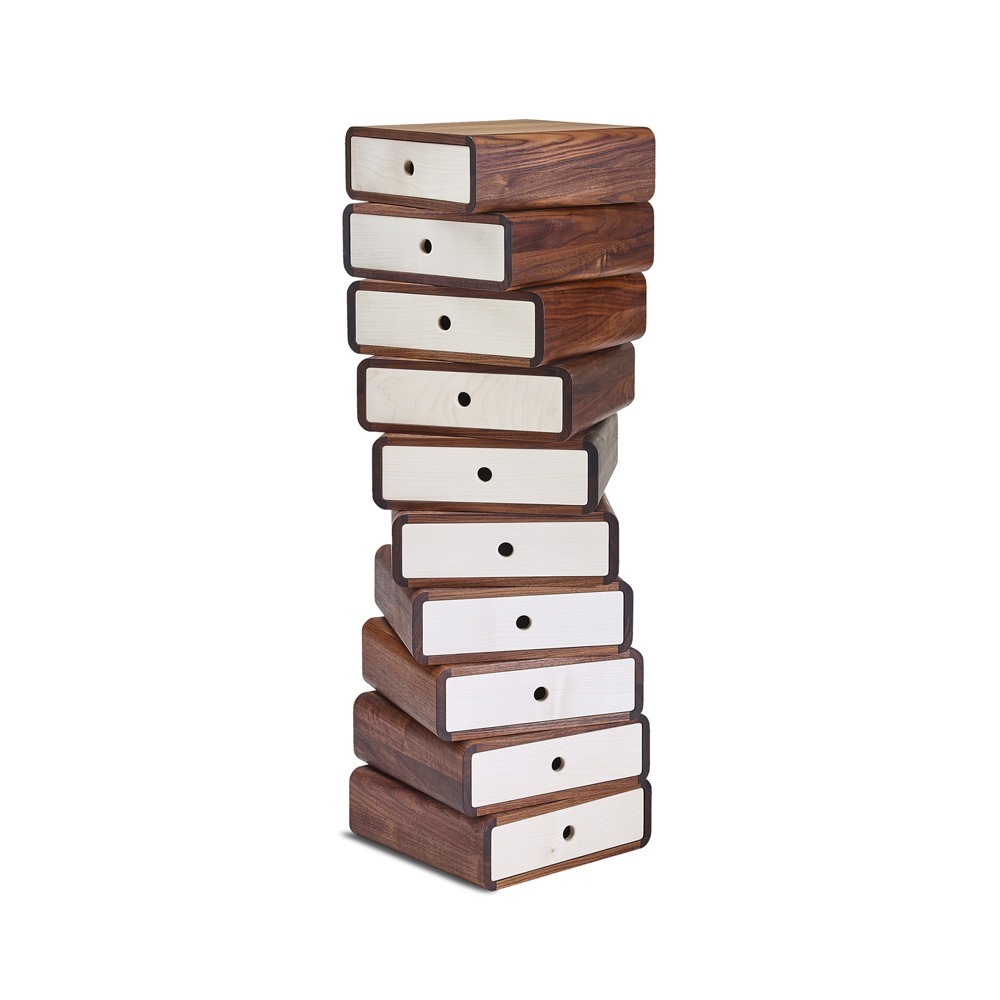 AK 1020 är en vacker och annorlunda byrå från Naver Collection. Kombinationen mellan den mörka valnöten och den ljusa lönnen ger en snygg kombination. AK 1020 är som en egen skulptur som ger dig möjlighet att själv designa din byrå då det går att vrida 360grader på varje låda. En byrå för dig som önskar något annorlunda och snyggt med en fantastisk finish.