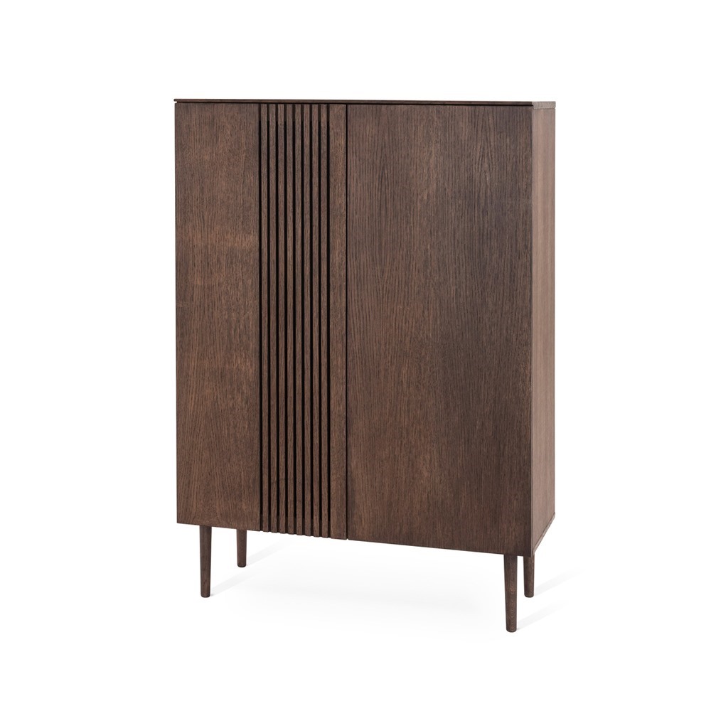 Joel skåp i fanerad rökoljad ek. Två dörrar med push to open beslag. två flyttbara hyllplan bak varje dörr ger möjlighet till flexibel förvaring.